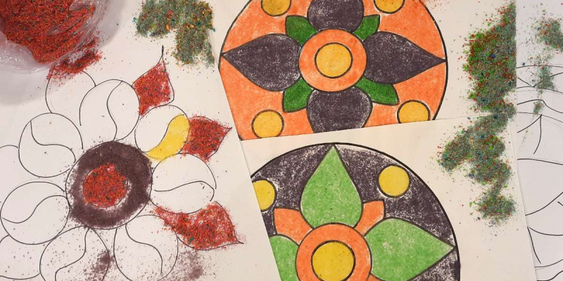 Ispirati dai colori, dalle voci, dai profumi del Divali, la festa indiana delle luci, i partecipanti potranno usare materiali inconsueti per creare il proprio lavoro ispirato ai rangoli, i tradizionali disegni variopinti che si realizzano sul pavimento, con polveri e diversi materiali, in occasione di festività e cerimonie.