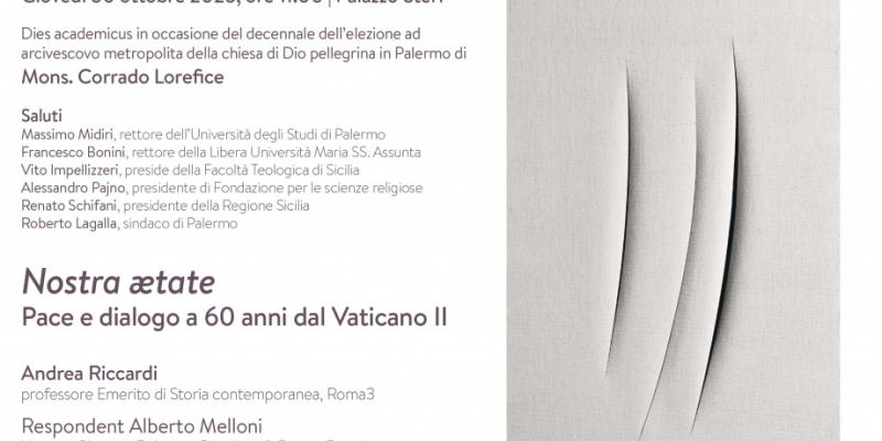 In occasione del decennale dell’elezione ad arcivescovo metropolita della Chiesa di Dio pellegrina in Palermo di S.E. Mons. Corrado Lorefice, l’Università degli Studi di Palermo, la Libera Università “Maria SS. Assunta”, la Facoltà Teologica di Sicilia e la Fondazione per le Scienze Religiose promuovono il Dies Academicus “Nostra ætate. Pace e dialogo a 60 anni dal Vaticano II”.L’evento avrà luogo giovedì 30 ottobre 2025 alle ore 11.00 presso il palazzo monumentale dello Steri, sito in Piazza Marina 60 (PA), e sarà l’occasione per riflettere sul lascito del Concilio Vaticano II nella costruzione di relazioni fondate sul riconoscimento reciproco, sull’incontro tra fedi e culture e sulla responsabilità pubblica delle istituzioni ecclesiali a sessant’anni dalla chiusura dei lavori.