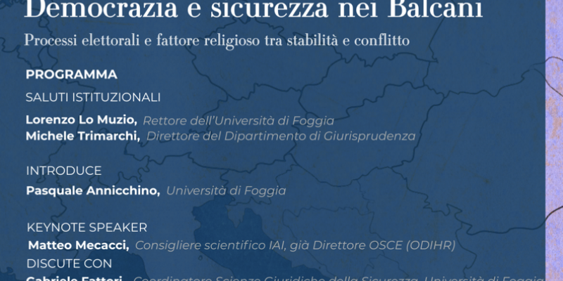 Il Dipartimento di Giurisprudenza dell’Università di Foggia organizza il seminario “Democrazia e sicurezza nei Balcani. Processi elettorali e fattore religioso tra stabilità e conflitto”, un incontro di approfondimento dedicato alla complessa interazione tra i processi di consolidamento democratico e le sfide alla sicurezza nella regione balcanica.