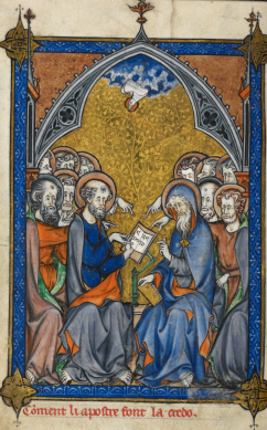 I Dodici mentre scrivono il Credo Apostolico, direttamente ispirati dallo Spirito Santo (manoscritto del XIII secolo) (fonte: BL).