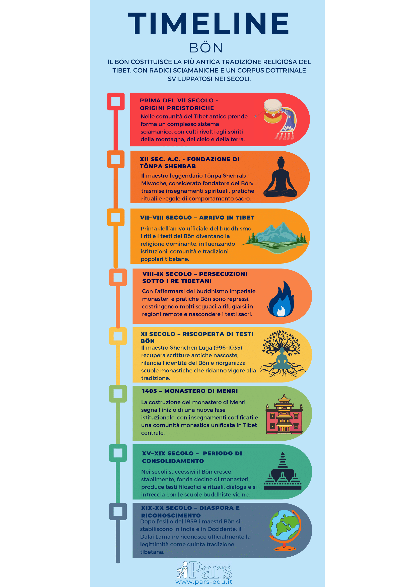 Dalle montagne tibetane, prima del VII secolo, il Bön plasma culti sciamanici e cosmologie autoctone. Con l’arrivo del buddhismo imperiale (VIII–IX sec.) viene perseguitato e costretto a nascondere i propri testi; nell’XI sec. la riscoperta di manoscritti nascosti e la fondazione di monasteri come Menri (1405) lo rilanciano come tradizione monastica e filosofica. Dopo la diaspora del 1959, i maestri Bön portano la loro eredità in India e in Occidente, ottenendo dal Dalai Lama il riconoscimento di quinta scuola tibetana e continuando a influenzare la spiritualità contemporanea.