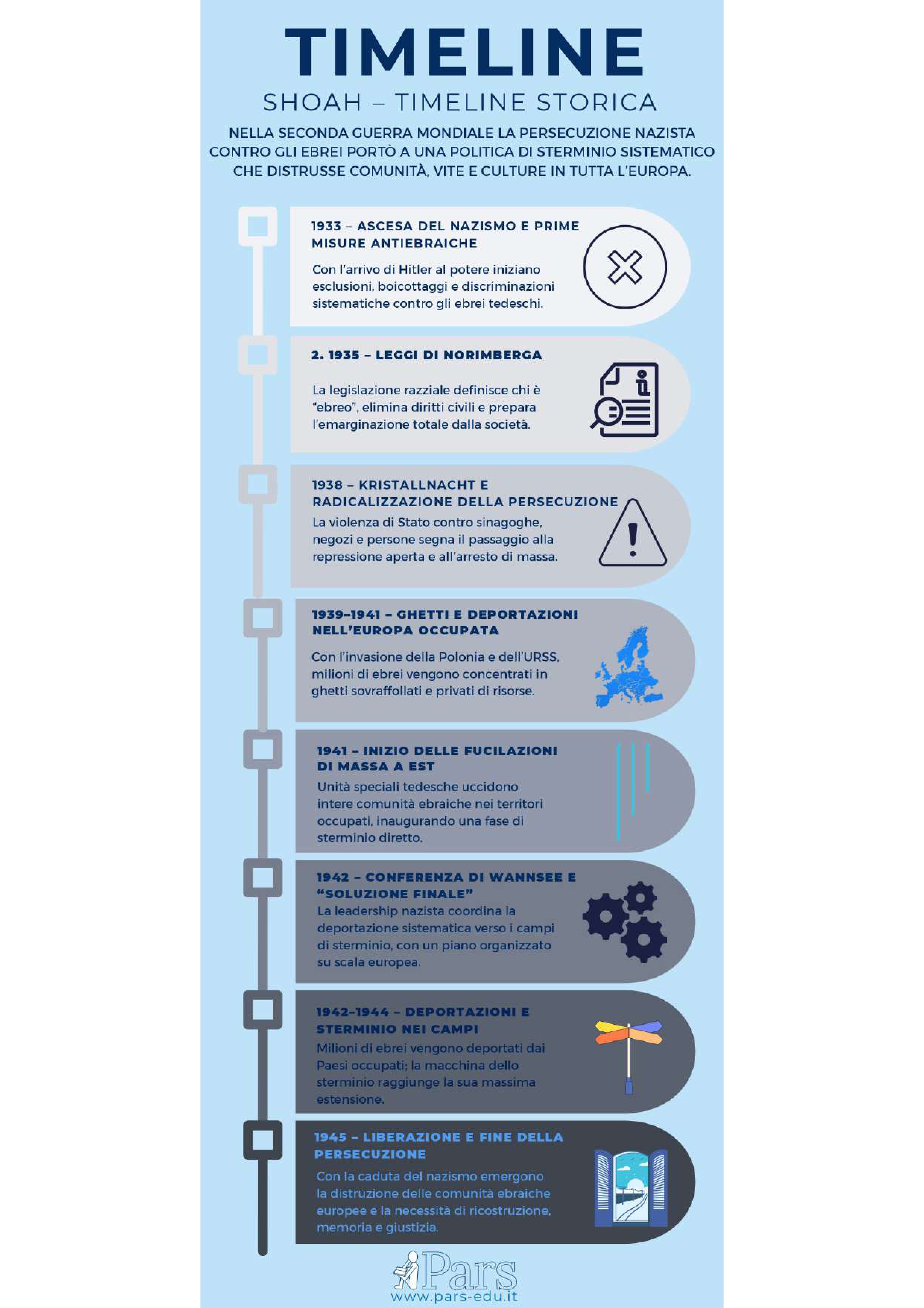 La Shoah rappresenta la distruzione sistematica delle comunità ebraiche europee durante la Seconda guerra mondiale, un processo che nasce da decenni di antisemitismo politico, legislativo e culturale. Con l’ascesa del nazionalsocialismo in Germania, le discriminazioni si trasformano in politiche di esclusione, persecuzione e progressiva disumanizzazione, fino alle leggi razziali, ai ghetti e alle deportazioni. Tra il 1941 e il 1945, nei territori occupati e nei campi di sterminio, milioni di ebrei vengono uccisi attraverso fucilazioni di massa, fame, lavori forzati e camere a gas. La Shoah colpisce famiglie, tradizioni e intere comunità, cancellando secoli di vita culturale e religiosa. Dopo la guerra, la ricostruzione della memoria diventa un elemento centrale dell’identità ebraica contemporanea: testimonianze, studi storici e luoghi della memoria contribuiscono a comprendere la portata dell’evento e a trasmetterne il significato alle generazioni successive. La Shoah rimane un punto di riferimento imprescindibile per riflettere su diritti, responsabilità e tutela della dignità umana.