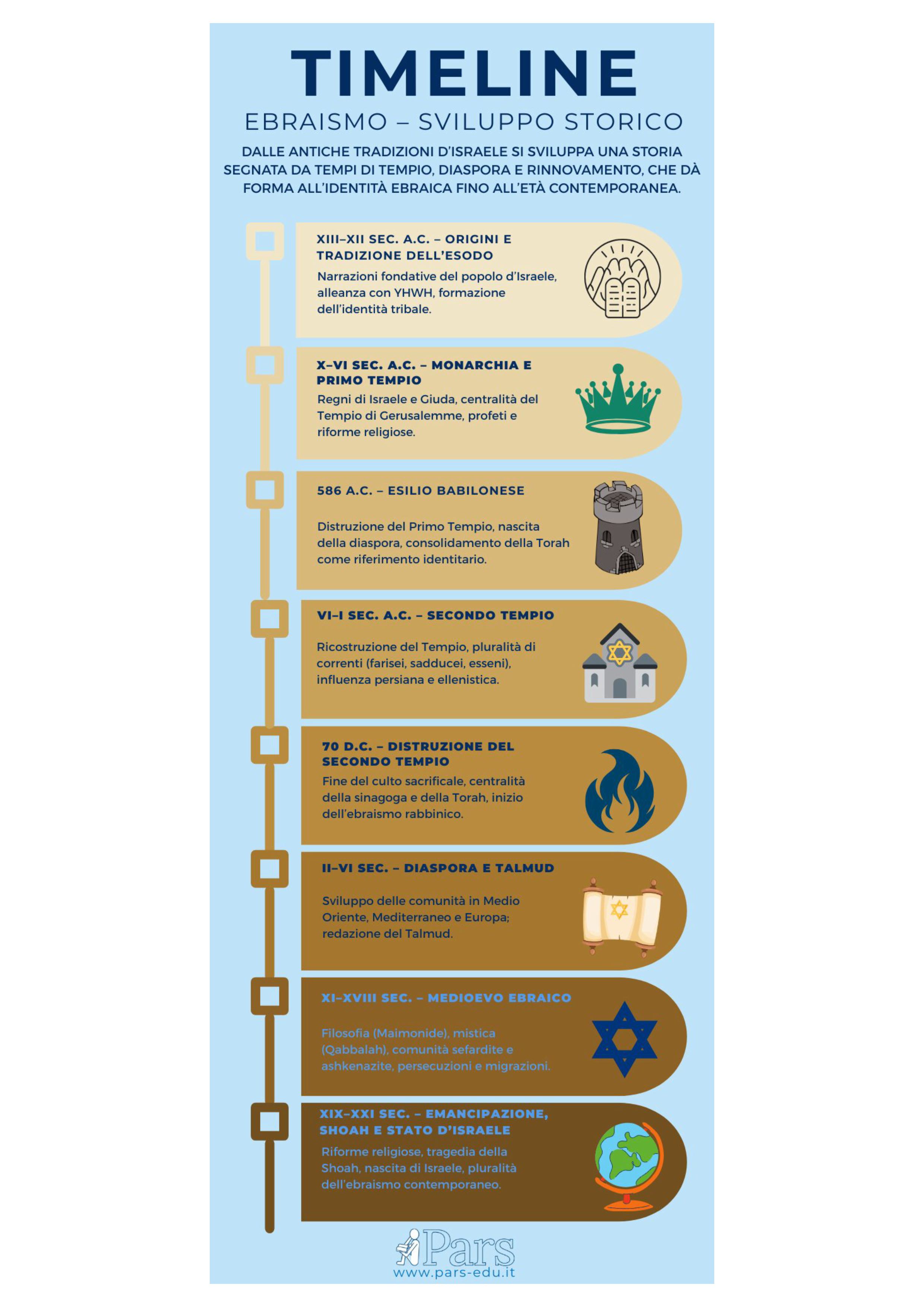 L’Ebraismo nasce nell’antico Vicino Oriente e si sviluppa attraverso una storia segnata da migrazioni, monarchie, esili e ritorni. Dalla formazione delle prime comunità israelitiche alla distruzione del Tempio, fino alla diaspora mediterranea, l’identità ebraica si struttura attorno alla memoria, alla legge e alla vita comunitaria. Nel Medioevo le comunità ebraiche si diffondono in Europa, Nord Africa e Medio Oriente, contribuendo alla cultura, alla filosofia e ai commerci. L’età moderna porta emancipazione, trasformazioni sociali e nuove correnti religiose, mentre il Novecento è segnato dalla Shoah e dalla nascita dello Stato di Israele. Oggi l’Ebraismo è una tradizione globale, con comunità diverse ma unite da una storia millenaria.